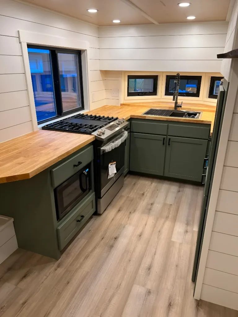 That tiny home kitchen from u/tinyhomeandgrown has an L-shaped layout with sage green lower cabinets that actually feel warm instead of cramped. The butcher block countertops add natural warmth, and those pass-through windows bring in light while keeping the space from feeling like a box. The under-cabinet lighting highlights the wood grain backsplash, and honestly, this has more character than plenty of full-sized kitchens.
