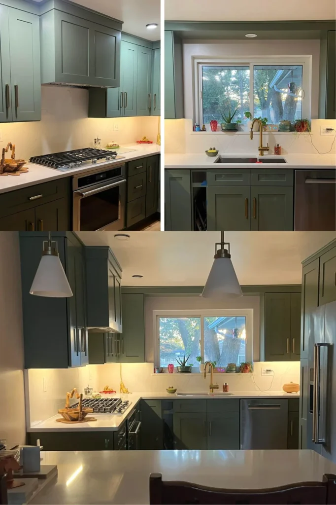 Sage green shaker cabinets with warm-toned LED under-cabinet lighting creates an inviting atmosphere that feels custom and high-end. u/Sloth_grls galley kitchen in particular gets the balance right between modern and warm – the white quartz countertops work perfectly with the gold hardware that adds elegance without being flashy. The big garden window brings natural light and creates a perfect spot for plants, and honestly, this kitchen could be in a design magazine.