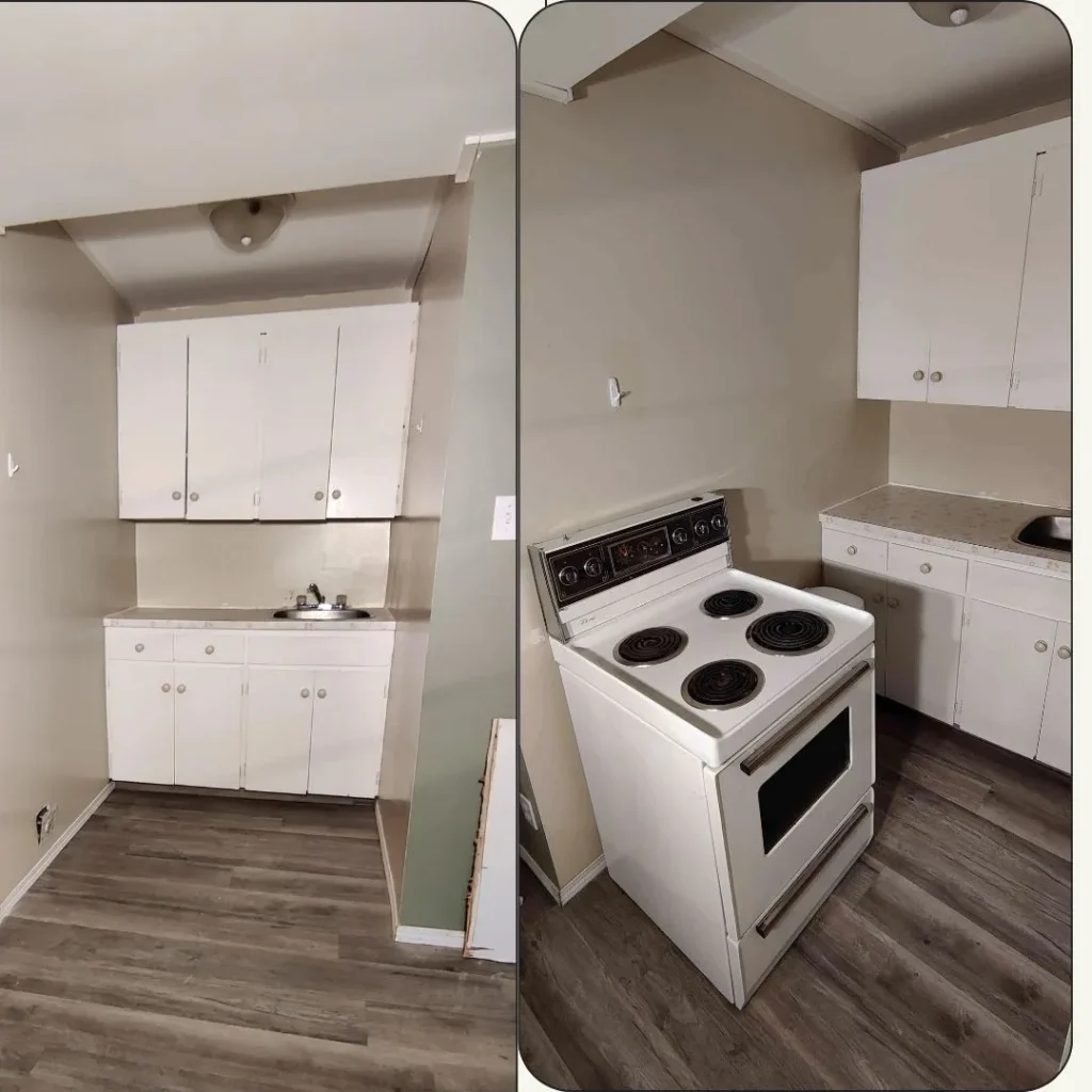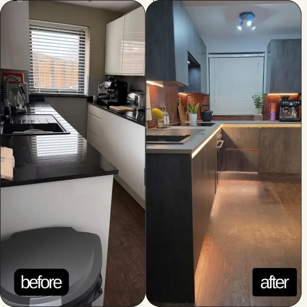 Going dramatic and dark actually works in small kitchens. u/Aneres88‘s transformation went from basic white cabinets to moody sophisticated space with wood-tone cabinets and dark blue accents. The LED strip lighting under the cabinets creates an inviting glow that makes everything feel modern and intentional, and the wood-look tile flooring adds warmth. The darker palette makes the small space feel more intimate and cozy rather than smaller.