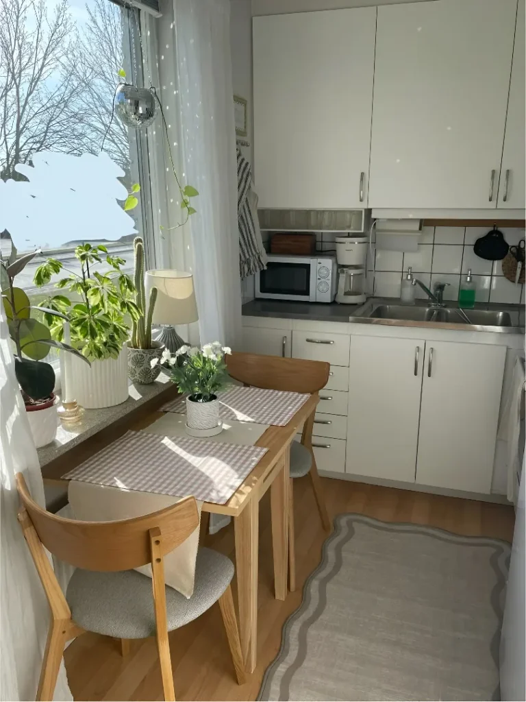 Scandinavian design basically invented small space living. u/CoolLie8‘s tiny galley kitchen is pure charm with all-white cabinets keeping the narrow space open, and that massive window flooding natural light is absolutely crucial. The light wood dining table doubles as prep space, and houseplants bring life without cluttering counters. That string of fairy lights by the window adds coziness, and everything feels intentional instead of squeezed in.