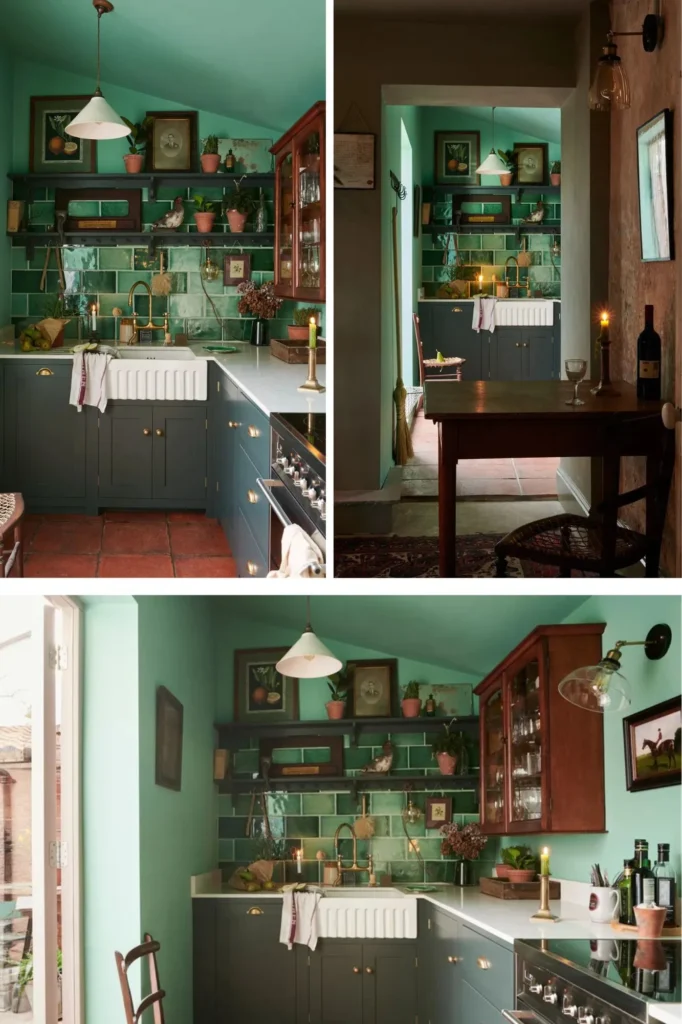 u/ManiaforBeatles‘s moody green kitchen basically is a mood board come to life – mint green ceiling paired with dark green subway tiles creates this layered, immersive color story. The dark teal cabinets with brass hardware tie everything together, and that antique farmhouse sink plus open shelving displaying terra cotta and vintage frames shows this kitchen is meant to be lived in. The glossy green tiles catch light gorgeously, and the terracotta floor tiles ground the space with Mediterranean warmth.