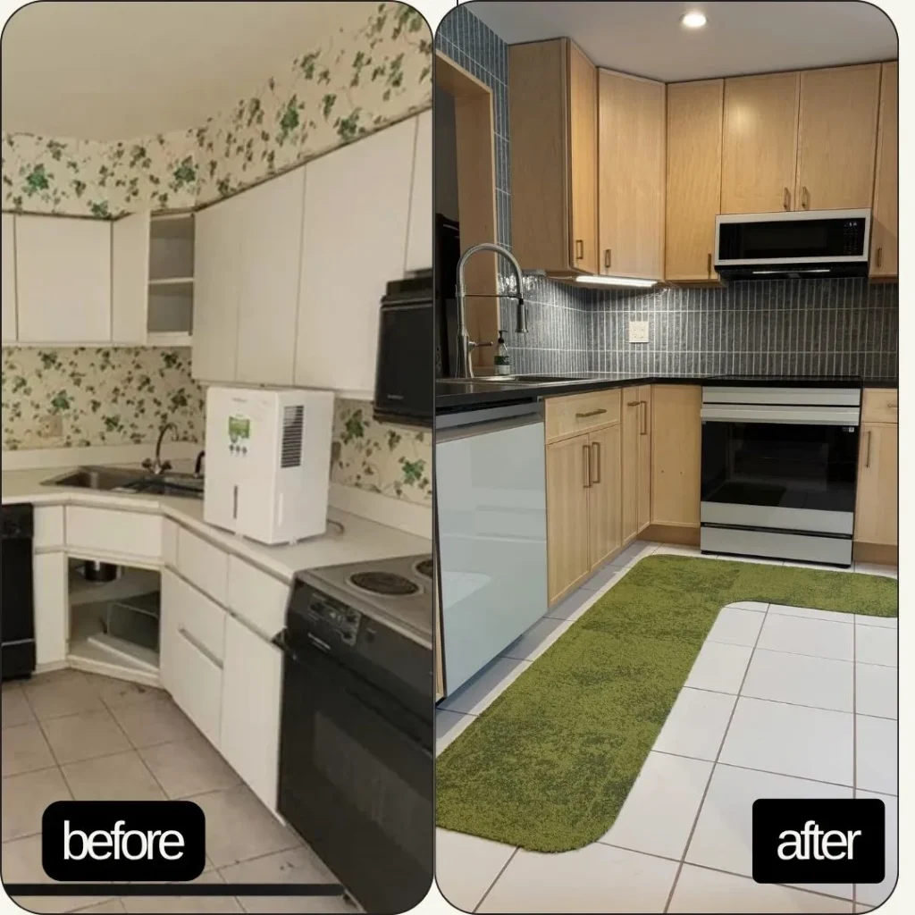 That dated-to-modern transformation from u/u/Vegetable-Today took ivy wallpaper and basic cabinets and turned it into sleek contemporary space with natural wood tones. The “after” features gorgeous light wood cabinets that bring warmth without feeling rustic, paired with sleek black countertops and that stunning charcoal vertical tile backsplash that adds serious visual interest. The grass-green runner adds bold personality and ties into natural tones beautifully.