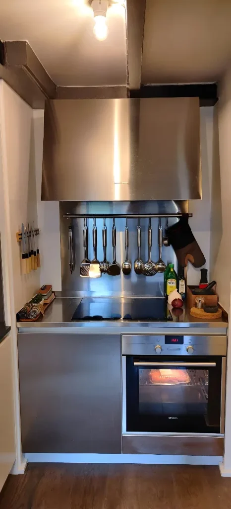 Ultra-compact studio kitchens prove what smart micro-living actually looks like. u/Jherker‘s all-stainless-steel situation fits into basically a closet-sized footprint with everything essential packed into one sleek unit. The integrated cooktop and oven show you don’t need sprawling counter space, and the magnetic knife strip plus hanging utensil bar maximize vertical storage. The industrial aesthetic makes the small size feel intentional rather than compromising.
