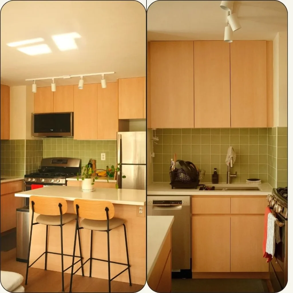 Retro vibes in a compact space actually work when done right. u/Usual-Maize-7021 paired warm blonde wood cabinets with olive green square tile that feels like mid-century modern done correctly. The breakfast nook creates a defined eating area without needing a separate dining room, and simple white track lighting keeps things practical without being boring. Those little cacti and styled pieces tie into the backsplash color, and this kitchen just feels warm.