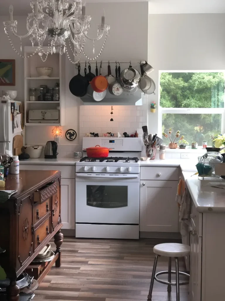 Eclectic style beats matchy-matchy perfection. u/smjengo’s white kitchen with a crystal chandelier hanging over the cooking area is such an unexpected choice, and it totally works because who says kitchens have to be purely functional? The white subway tile and open shelving create a classic backdrop, but the styling is where this really shines – hanging pots and pans add function and interest, that vintage wooden dresser brings warmth, and the mix of artwork makes this feel authentically homey.