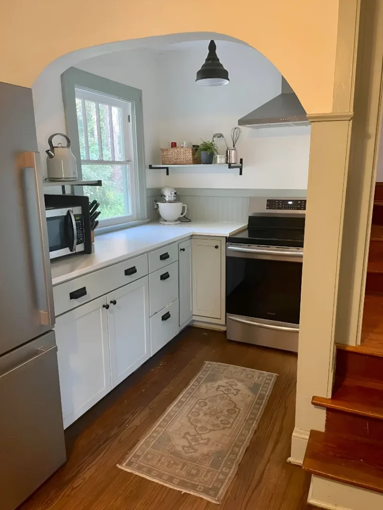 That little kitchen tucked into an alcove from u/sarahkatttttt is adorable, partly because of the arched doorway that gives it actual architectural character. The white shaker cabinets with black cup pull hardware create classic farmhouse vibes that don’t go out of style, and beadboard backsplash adds texture and cottage charm. Open shelves with black brackets provide display space while keeping things accessible, and this proves even the smallest awkwardly-shaped spaces can become functional kitchens with the right approach.