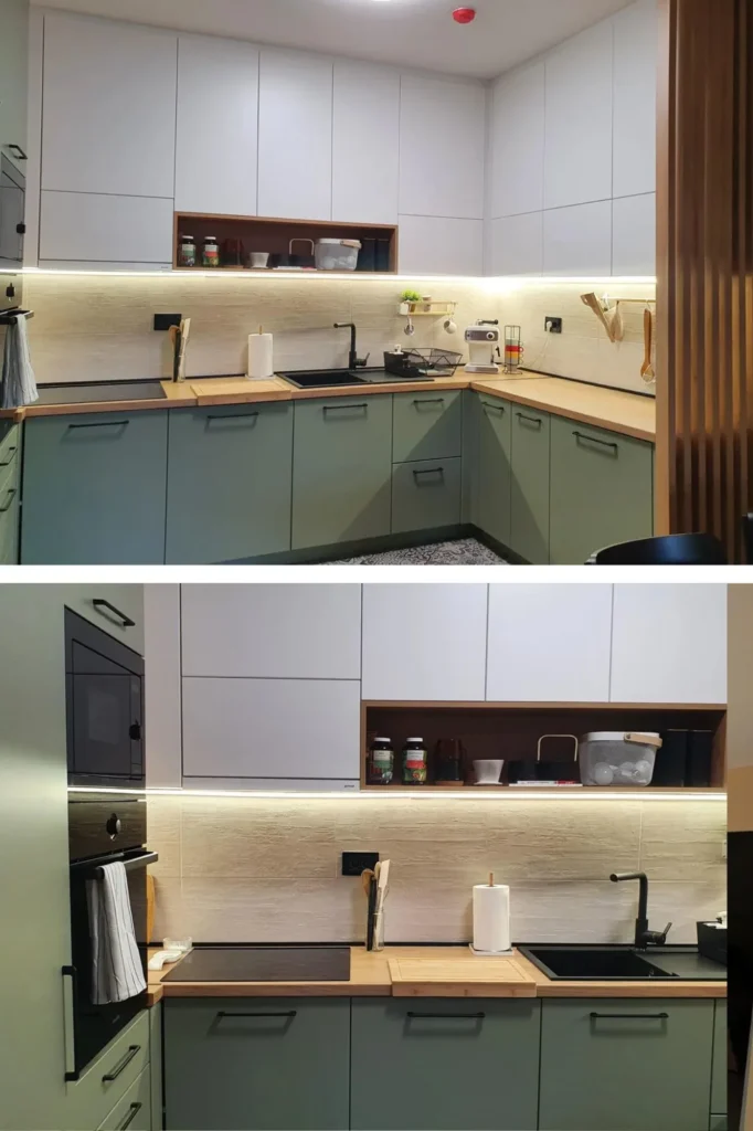 u/nnymphadora nailed contemporary minimalist with a two-tone approach – white uppers paired with sage green lowers that somehow feels both open and intentional. The handleless cabinets keep lines clean, and that open display niche with walnut backing breaks up all the cabinetry in a smart way. The black fixtures and hardware provide contrast without feeling heavy, and everything just flows together. The corner layout maximizes wall space because nothing can go to waste here.
