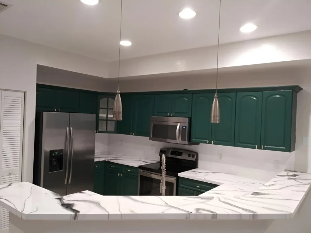 Bold emerald cabinets with white marble is peak glamour move. u/morticianmagic went all-in and the result is sophisticated without being stuffy. The glossy cabinet finish reflects light beautifully, making the small space feel less cramped despite the bold color. Those hammered metal pendant lights add artisanal touch, and keeping walls neutral lets the cabinets be the star. The marble countertop’s dramatic veining adds luxury that ties into the white ceiling perfectly.