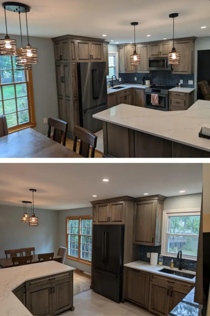 Before-and-after transformations hit different when someone actually commits. u/Dylaximus‘s renovation went from dated builder-grade everything to driftwood-finish cabinets with stunning white marble that elevates the whole space. Those caged pendant lights add rustic-industrial vibes, and the dark geometric backsplash draws the eye upward, making everything feel taller. The marble island anchors the room without overwhelming the modest square footage.