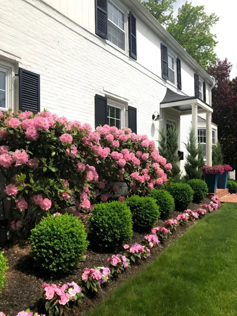 Your house’s exterior is the first thing people see and the last thing most homeowners bother to style properly. Fix that immediately. A white brick facade with black shutters is already a strong hand — don’t waste it on a bare foundation and a patch of struggling grass. Plant a full-scale rhododendron that blooms so aggressively pink in spring it practically introduces itself, then line the border beneath it with clipped boxwood spheres at even intervals and fill every gap with impatiens in matching pink. The layering is the whole technique: tall flowering shrub at the back, sculptural evergreen balls in the middle, low seasonal color at the front edge. Flank the entry with columnar conifers in navy planters for vertical punctuation. Rule: your front garden should look like it was designed, not just planted — the difference is layers, repetition, and the confidence to go big on one hero plant.