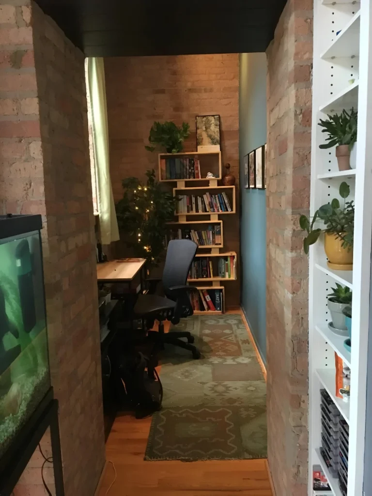 This narrow study nook makes incredible use of what looks like a tight hallway or awkward space. u/chicagorpgnorth carved out a proper workspace in that exposed brick alcove that’s basically a sliver of space most people would leave empty. That geometric bookshelf climbing the wood-paneled wall is both functional and sculptural—it provides storage while adding visual interest. The simple wood desk keeps the footprint minimal. That ergonomic office chair fits perfectly in the narrow space. The LED strip lighting along the edge creates ambient glow without taking up any room. Plants tucked in with the books soften all those hard surfaces. The vintage rug defines the work zone and adds warmth underfoot. The exposed brick on either side adds so much character and texture. The black painted ceiling makes the nook feel more intimate and defined. This setup proves that you can create a legitimate workspace in the most unlikely spots when you get creative with vertical storage and lighting.