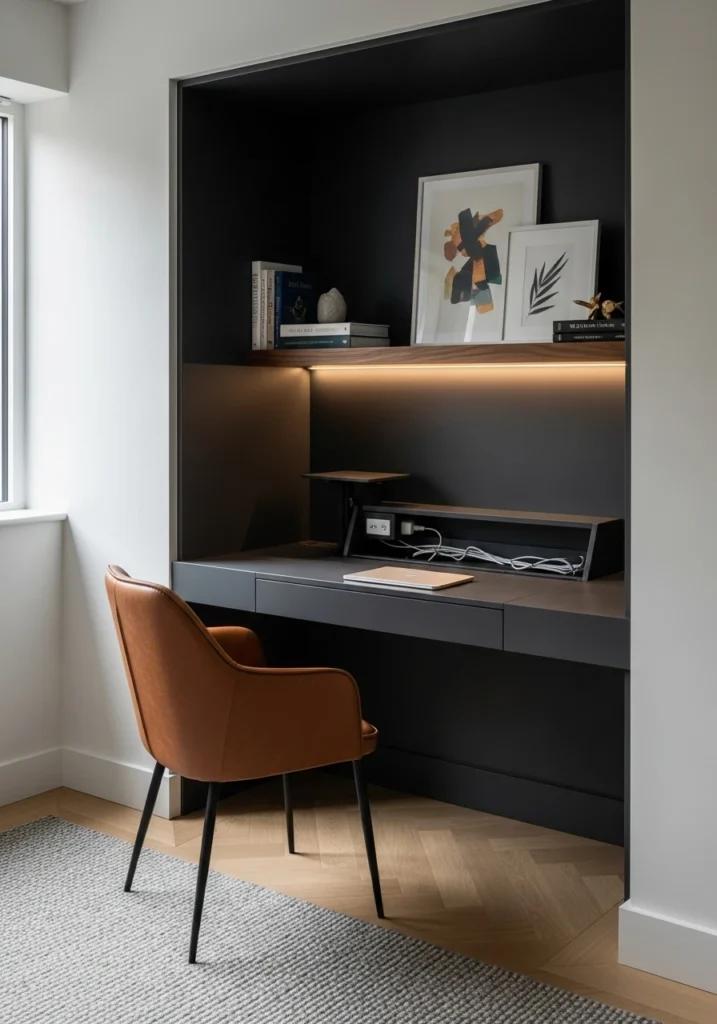 The concept of a built-in desk with concealed tech is all about maintaining visual calm while hiding practical necessities. Picture a compact recessed desk in dark matte lacquer with a pop-up power module and hidden cable tray—everything you need is there, but when not in use, surfaces stay clean and clutter-free. A slim walnut floating shelf above holds books and art. Integrated under-shelf LED strips provide warm task lighting. An upholstered leather desk chair in cognac adds comfort and warmth. A low-profile noise-reducing rug dampens sound. Pale oak herringbone flooring adds pattern and elegance. Soft daylight from a narrow side window provides natural illumination. This approach works because it acknowledges that tech is necessary but doesn’t need to dominate the aesthetic—concealing cables and power while keeping them accessible creates spaces that feel calm and intentional.