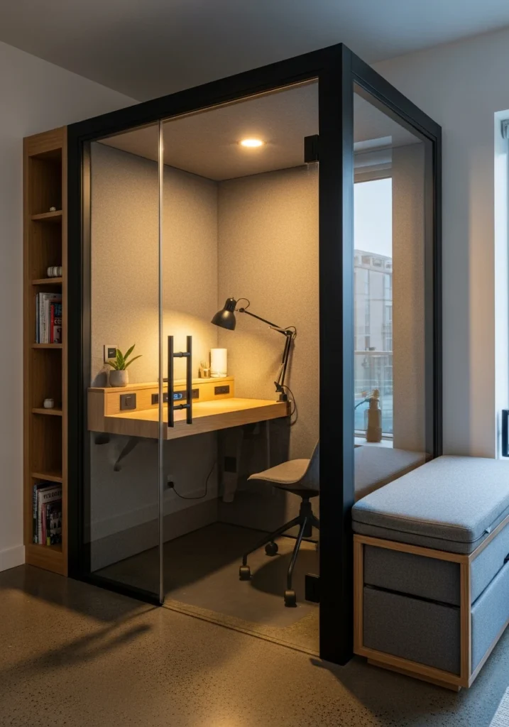 A glass pod study nook takes the concept of a dedicated workspace to an architectural level. Imagine a small soundproof glass-framed pod inside an apartment—basically a room within a room. An oak micro-desk with wireless charging provides the work surface. Ambient warm downlight and an adjustable task arm lamp create layered lighting. The matte black frame with smoked glass door defines the space while maintaining visual connection to the rest of the home. A built-in mini-bookshelf and folded cushion bench sit just outside the pod. Polished concrete floors feel modern and seamless. Evening mode with soft warm glow makes it feel like a cocoon for focus. This concept is brilliant for open-plan living where you need both visual separation and acoustic privacy—the transparent walls maintain openness while the soundproofing creates actual functional boundaries.