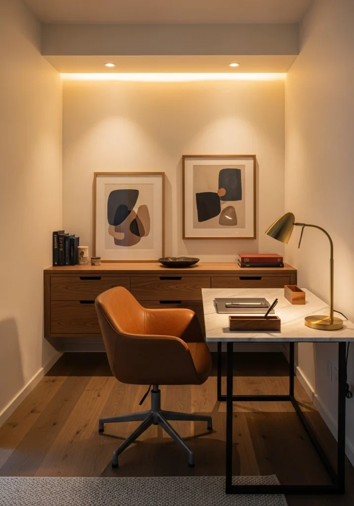 The executive leather and marble approach brings luxury materials into compact study spaces. Picture a slim marble-topped desk that feels substantial but doesn’t eat up floor space. A leather-clad swivel chair adds comfort and sophistication. A brass desk lamp and pen tray bring in metallic warmth. Wall-mounted walnut cabinets with soft-close drawers provide storage without bulk. Framed abstract art in muted tones adds personality. Recessed warm cove lighting washes the ceiling while a spotlight focuses on the desk. Dark-stained oak floors with a small wool rug underfoot add warmth and texture. This approach proves that compact doesn’t have to mean cheap or basic—investing in quality materials makes even small workspaces feel intentional and inspiring.
