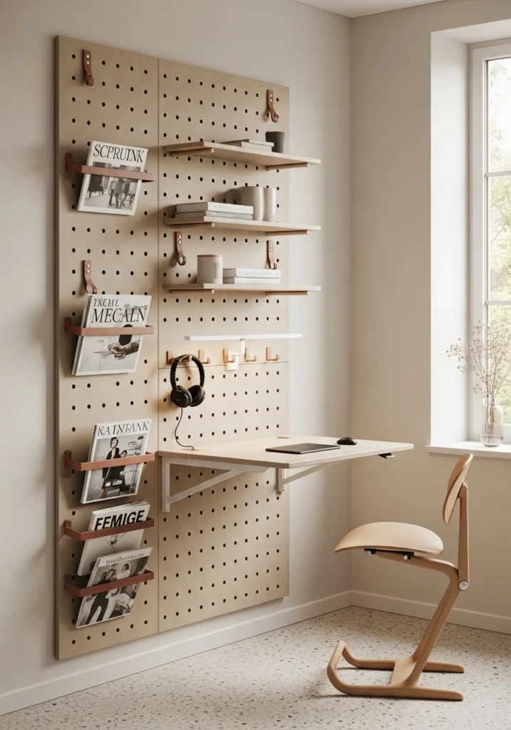 Vertical reference walls with fold-out desks maximize tight spaces brilliantly. The concept uses tall lacquered pegwall panels with modular shelving and magazine rails—everything’s within reach but vertical rather than spreading horizontally. A fold-out desk brackets to the wall and converts to standing height, giving flexibility throughout the day. Leather strap hooks hold headphones or bags. Narrow LED task strips provide focused light. Pale microcement floors feel modern and clean. A compact ergonomic stool tucks away when not needed. Daylight from a side window creates soft shadows that emphasize the three-dimensional storage. This approach is perfect for small apartments where dedicating permanent floor space to a desk feels wasteful—the ability to fold everything away means the space can serve multiple purposes.