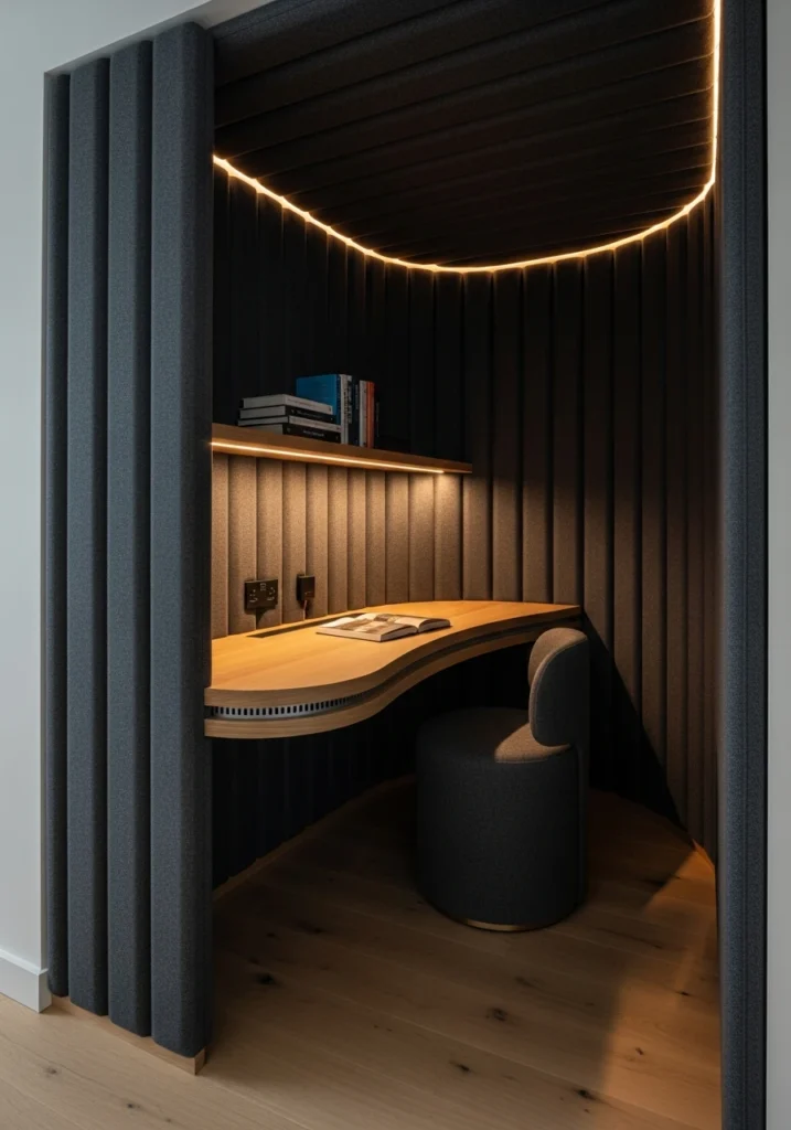 Curved acoustic alcoves create focus through both form and function. Imagine a small curved niche wrapped in sculpted acoustic fabric panels in deep graphite—the shape embraces you while the material absorbs sound for better concentration. A curved timber desk with integrated cable channels keeps cords managed. A thin backlit shelf holds reference books. Dimmable warm perimeter lighting creates a soft cocoon effect without being overly “zen” or spa-like. A plush upholstered stool provides comfortable seating. Pale oak flooring outside the alcove creates contrast and definition. This concept works because it addresses both the physical and psychological aspects of focus—the curved walls create a sense of enclosure and safety, while the acoustic treatment actually improves the sound environment for calls or concentration.