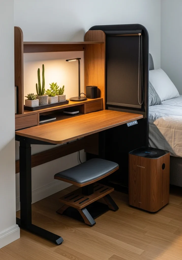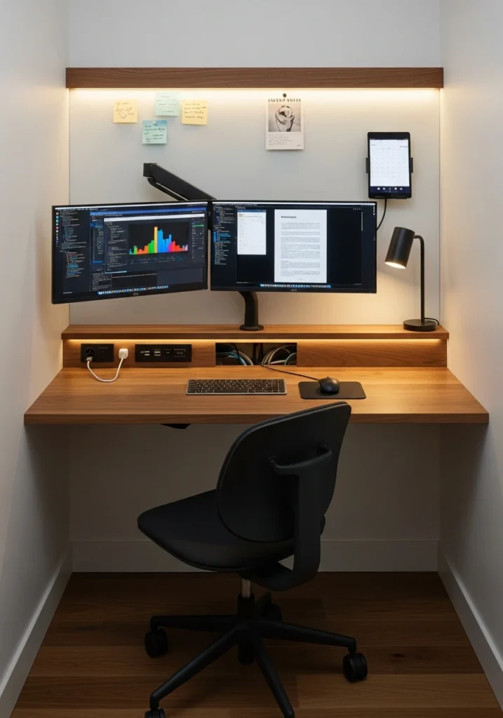 The tech-integrated command desk concept is for people who need serious digital setup in compact spaces. Picture a narrow walnut desk with dual-monitor arm mounts—screens float above the surface, freeing up valuable desk real estate. Recessed under-desk power and USB banks keep charging accessible but hidden. Magnetic whiteboard strips and mounted tablet docks provide flexible tool access. A matte black task chair with lumbar support addresses ergonomics. Discreet cable management troughs keep cords organized and invisible. Cool daylight balanced with a warm task lamp creates proper lighting for screens and paperwork. This approach acknowledges that modern work requires multiple devices and connections—instead of fighting that reality, it embraces and organizes it beautifully.