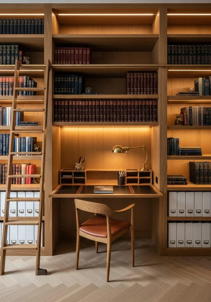 Library walls with micro workbays create impressive storage while carving out functional workspace. The concept features floor-to-ceiling oak shelving with a ladder rail for accessing high shelves. A small pull-out desk surface with leather inlay provides just enough workspace. Curated books and vertical file slots keep everything organized and accessible. A brass reading lamp integrates right into the shelving. Layered warm LEDs on each shelf create ambient glow that highlights the collection. Pale herringbone floors add elegance. This approach is perfect for book lovers who need workspace—the library wall becomes the design statement while the small desk niche provides practical function without dominating the room.