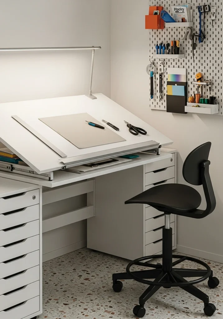 Lightbox desks for creative work bring specialized function into compact footprints. Imagine a narrow drafting-style desk with an integrated lightbox surface for reviewing prints, tracing, or detailed creative tasks. Slim storage drawers below hold paper and tools. Adjustable LED edge lights with color-temp control let you match lighting to the task. Matte white finish reflects clean light upward. A black ergonomic stool provides seating. Pegboard on the adjacent wall organizes tools and materials visibly. Pale terrazzo floors feel modern and durable. This specialized approach works for illustrators, designers, or anyone doing detailed visual work who needs proper task-specific lighting and organization.