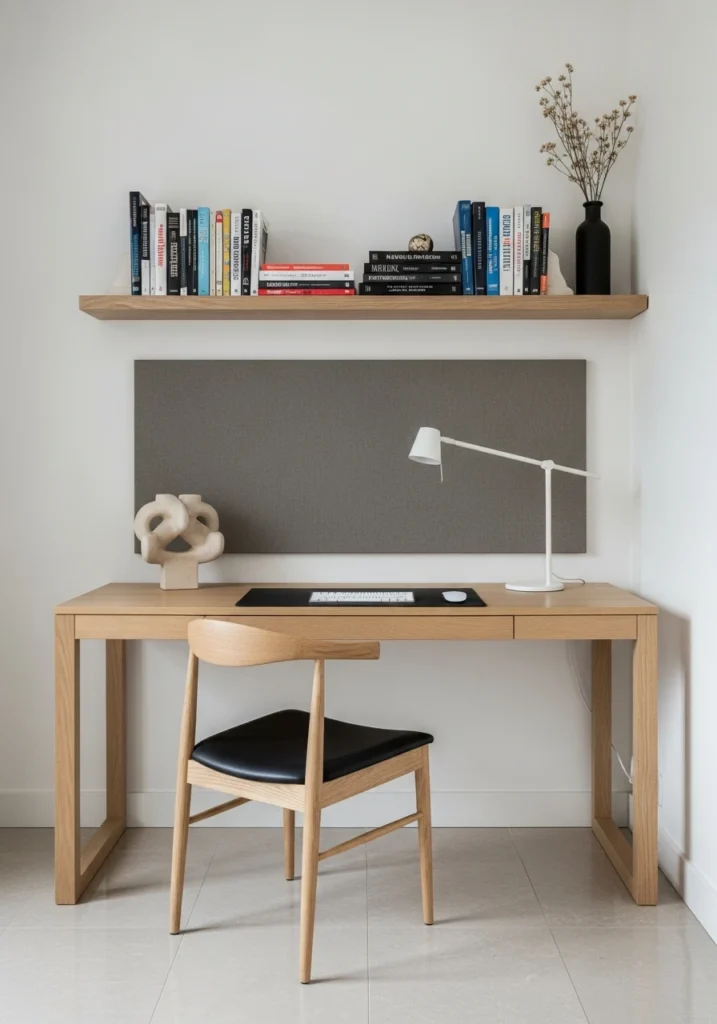 The curated minimalist study with gallery backdrop is about creating inspiring simplicity. Picture a pared-back desk in pale oak with a single sculptural object providing visual interest. A gallery-style matte wall behind allows for rotating art or prints—your inspiration can evolve with your projects. A low-profile task lamp and slim wireless keyboard tray keep technology minimal and unobtrusive. A floating shelf holds curated reference books—just the essentials, not a full library. Gloss-finish stone tile underfoot reflects subtle light and feels luxurious. This approach creates an intentional creative studio in miniature where every element is chosen carefully and nothing extraneous remains—the emptiness becomes a canvas for focused thought.
