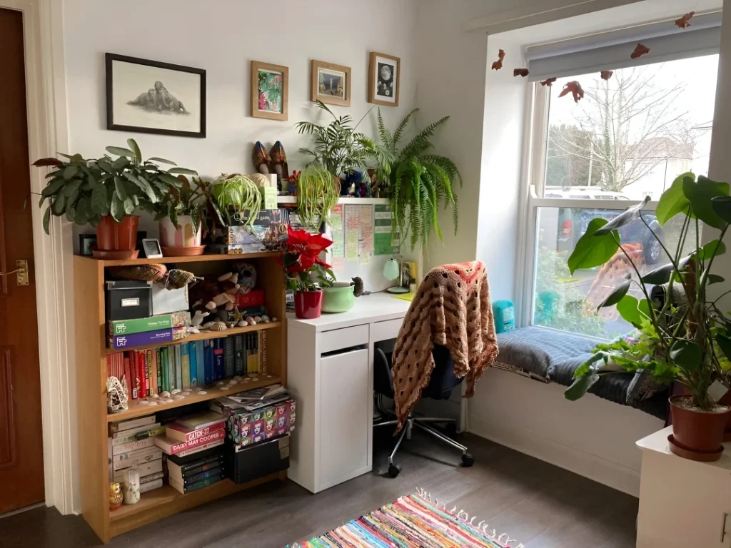 This study space is basically a plant jungle that happens to have a desk in it. u/iulipuppybaroness set up a corner workspace that’s overflowing with greenery—hanging plants, shelf plants, windowsill plants, floor plants. The simple white desk keeps things feeling clean despite all the visual activity. That white storage unit with drawers provides practical organization for supplies and books. The gallery wall of eclectic art adds personality and color. The ergonomic chair with that cozy throw draped over it looks actually comfortable for long work sessions. The large window floods the space with natural light, which is perfect for all those plants and makes the workspace feel bright and energizing. The colorful striped rug grounds the area and adds pattern. That little task lamp on the desk provides focused light. This setup shows how plants can completely transform a workspace from boring to inspiring—the abundance of greenery makes you feel like you’re working in a conservatory rather than just another home office corner.