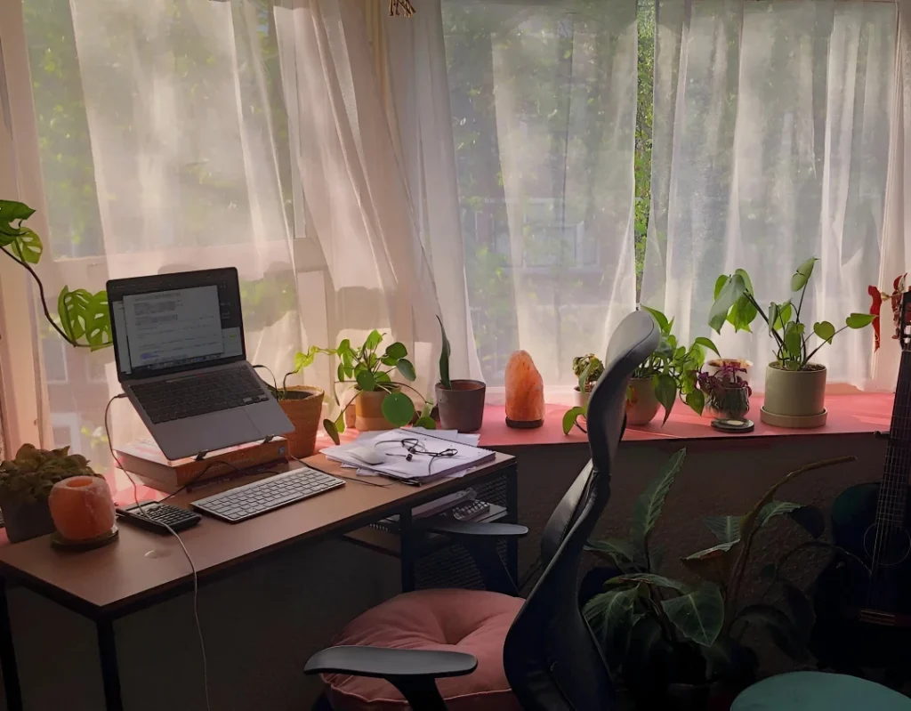 This study space embraces the biophilic design trend in the best way. u/MatteChili created a window desk setup that’s basically surrounded by plants—on the deep windowsill, on the desk, tucked around the ergonomic chair. The laptop on a stand keeps ergonomics in mind, paired with a separate keyboard for better posture. That mesh ergonomic chair shows attention to comfort for long work sessions. The pink cushion adds a pop of color and extra comfort. The sheer curtains filter natural light beautifully without blocking it completely. The Himalayan salt lamp adds warm ambient glow. The mix of plant varieties—trailing, upright, small succulents—creates such a lush, alive feeling. The simple white desk keeps things feeling clean and uncluttered despite all the greenery. This setup shows how bringing nature into your workspace can make it feel less like “work” and more like a retreat you actually want to spend time in.
