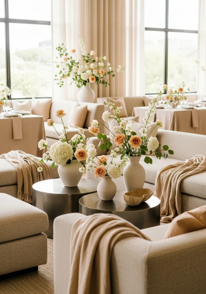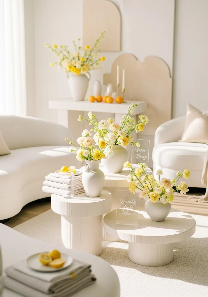 This setup captures that fresh summer feeling without going full lemonade stand. Soft citrus-inspired tones create a sunny backdrop, while curved ivory seating keeps things comfortable and modern. Low sculptural tables display matte ceramic vases filled with pale yellow and cream florals that feel seasonal without screaming “summer party.”