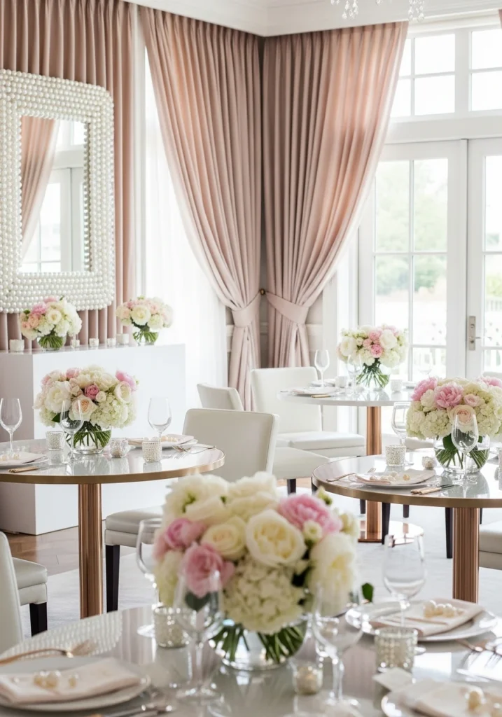Bringing garden vibes indoors without actual dirt or bugs. This setup features blush-toned wall draping that softens the entire space, while pearl-accent decor objects add just enough shine. Rounded pedestal tables hold delicate floral arrangements in soft whites and pale pinks that feel romantic without being overly sweet.