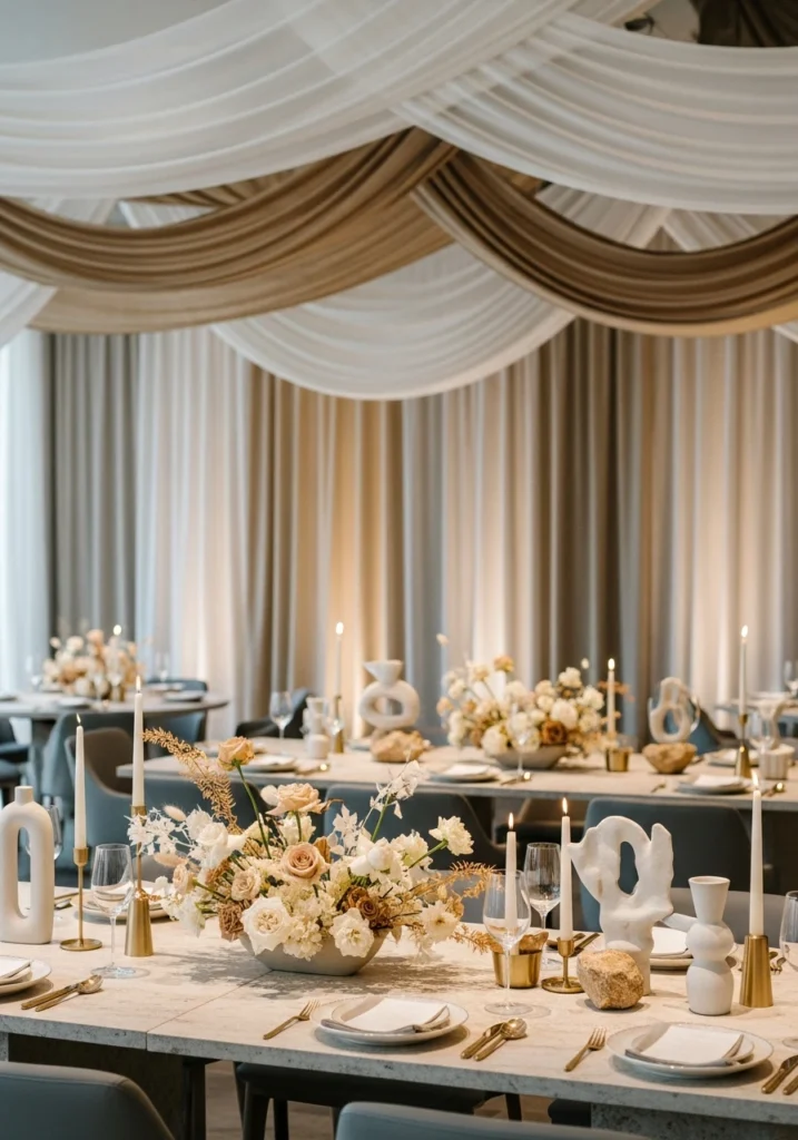Abstract floral installations bring organic elements without looking like you raided a garden center. Warm layered lighting enhances textures and adds depth to the space. The polished yet welcoming environment works perfectly for intimate gatherings where people actually want to stick around and socialize.