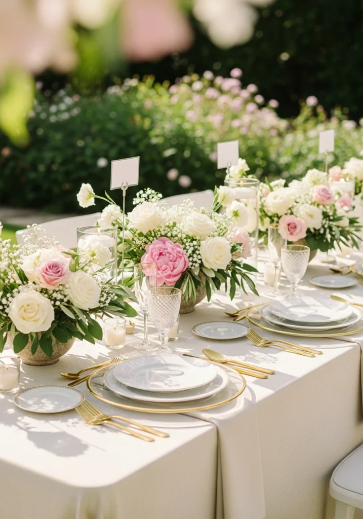 This tablescape knows exactly what it’s doing. The ivory tablecloth with subtle texture provides a beautiful neutral base, while champagne-toned tableware adds warmth without going full gold glitter. Low floral centerpieces in glass and stone vessels keep sightlines open so guests can actually talk to each other.