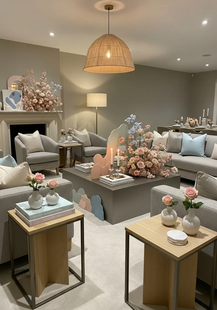 Pastels done for adults. This living room setup uses sage, blush, and soft blue in a way that feels intentional rather than baby-themed. Structured seating arrangements create natural conversation zones, while sculptural side tables hold curated decor objects that add personality.