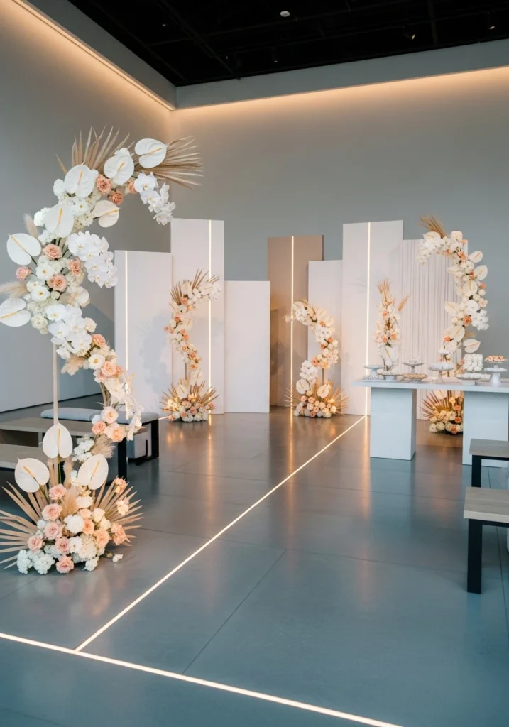 This setup treats flowers like the art form they are. Freestanding sculptural floral forms in soft whites and pale peach create these dramatic focal points throughout the space. Minimalist backdrop panels let the florals be the star without competing elements.