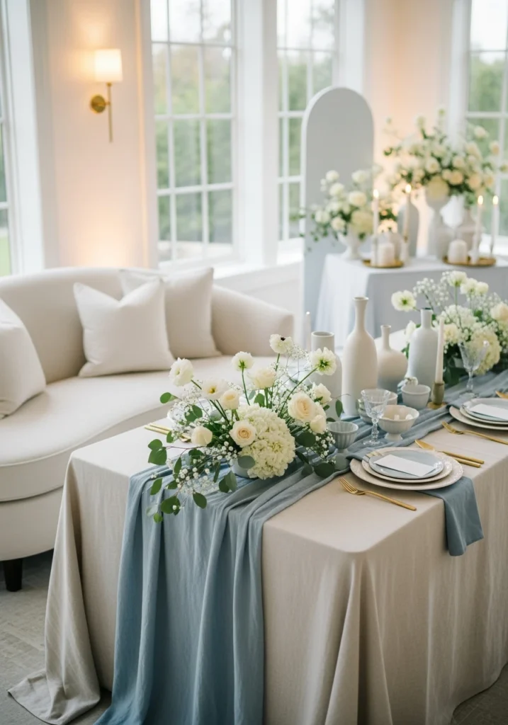 Brushed metal accents catch the daylight beautifully. The fresh seasonal feel comes from the lighting as much as the color palette. This refined and calming setup works for intimate celebrations where the focus is on meaningful connection rather than Instagram moments.