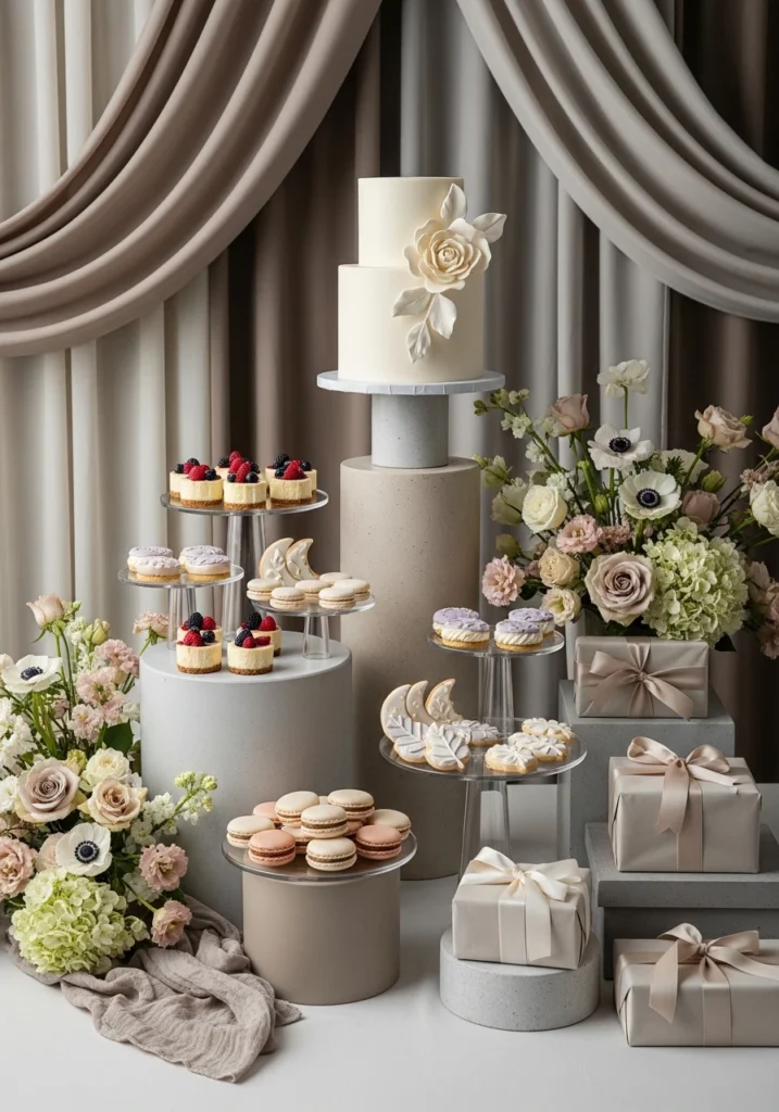 The dessert table deserves better than a grocery store cake on a plastic tablecloth. This setup uses stone pedestals and glass risers to create varying heights that make everything look more interesting. Neutral fabric backdrops provide clean visual space, while sculptural floral details add organic beauty.