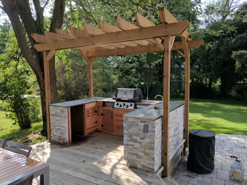 A massive cedar pergola sheltering an L-shaped outdoor kitchen with stacked stone bases, honey-toned wood cabinetry, and stainless steel countertops—this setup is proof that backyard cooking can look like it belongs in a resort brochure. The built-in gas grill anchors the center, flanked by a prep station and a corner sink, while the natural stone veneer on the island bases adds texture without looking like you raided a suburban fireplace store. Light wood decking underfoot transitions seamlessly to gray paver stones, creating zones without feeling choppy. The pergola’s open slat roof filters dappled sunlight during the day and serves as the perfect framework for string lights at night (because ambiance isn’t optional). Lush green lawn and mature trees in the background complete the “yes, I live here and yes, you’re jealous” aesthetic. This kitchen proves you don’t need a mansion to have a cooking setup that makes people want to hang out in your yard all summer. If you’re still wheeling out a portable grill every weekend, this photo just personally victimized you.