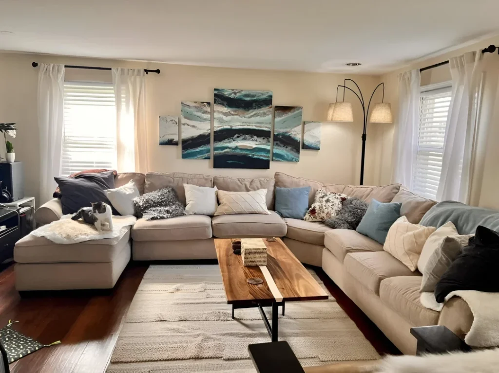 A massive beige L-shaped sectional drowning in pillows—sage blue, charcoal gray, textured cream, and a frankly aggressive amount of faux fur—anchors this living room like it owns the deed. Above it, a five-panel abstract ocean wave canvas in teal and charcoal adds the only drama this neutral palette will ever need, while a live-edge walnut coffee table with black metal legs sits on a pale geometric rug doing its quiet, hardworking thing. Sheer white curtains on matte black rods soften the California light pouring through the blinds, and that black arc floor lamp with twin shades in the corner is throwing just enough ambient glow to make evening hang-outs feel like an actual vibe. Dark wood floors ground the whole scene without competing for attention. Two cats have fully claimed this sectional as their personal kingdom, which is honestly the ultimate stamp of approval—if it’s cozy enough for a cat to sprawl on, it’s cozy enough for humans. This room understands one universal truth: comfort doesn’t have to apologize for itself. If your living room doesn’t make you want to cancel plans and sink into the couch with a book, you’re doing it wrong.
