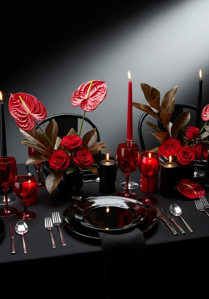 Bold move: dramatic high-fashion palette using matte black and deep red instead of the predictable pink explosion. The table layers black tablecloth, glossy black plates, sculptural red glassware, and sharp metallic cutlery because subtlety is for people without vision. Minimal but striking floral arrangements feature deep red anthuriums and roses with glossy leaves.