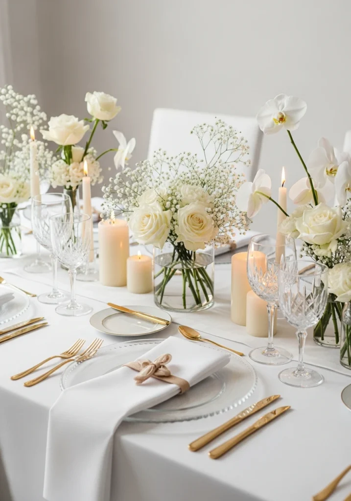 Ultra-elegant approach built around soft whites, champagne gold, and crystal textures—timeless refinement that doesn’t require trends. Crisp white linens, translucent glass chargers, crystal wine glasses, and subtle gold flatware create five-star hotel dining experience at home. Airy minimal floral arrangements use white roses, orchids, and baby’s breath in clear glass vessels.