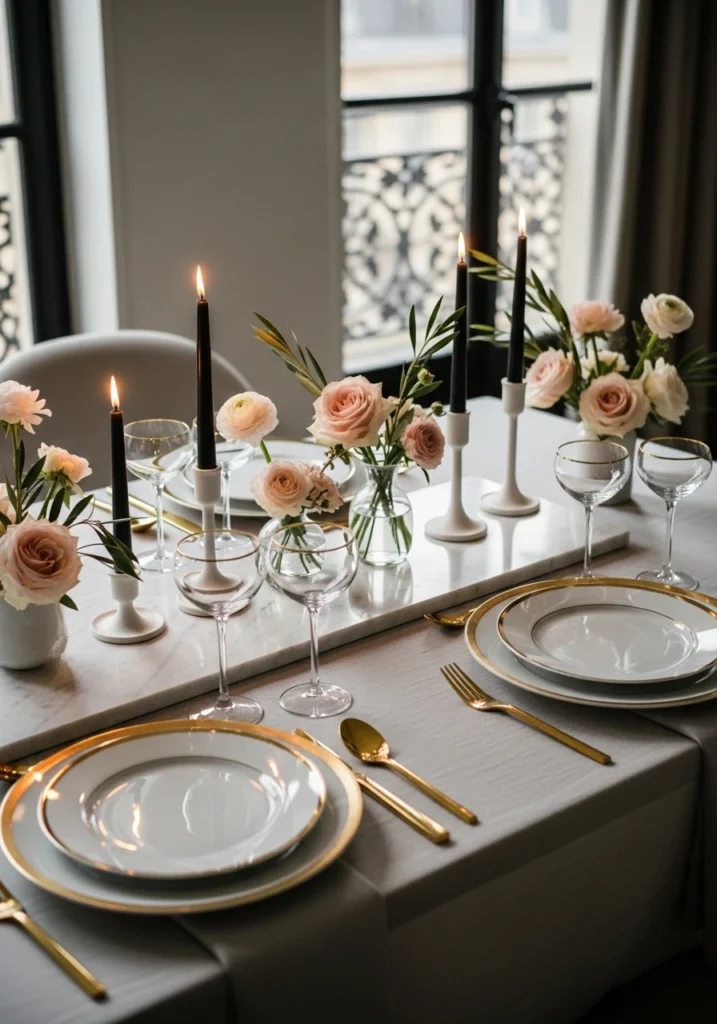 Chic modern Parisian-inspired tablescape featuring classic elegance with contemporary restraint—finally, someone who understands French style isn’t about excess. Neutral linens, marble accents, and delicate floral arrangements in pale pink and cream tones create foundation. Gold-rimmed plates, slim champagne coupes, and minimalist black candlesticks add subtle contrast.