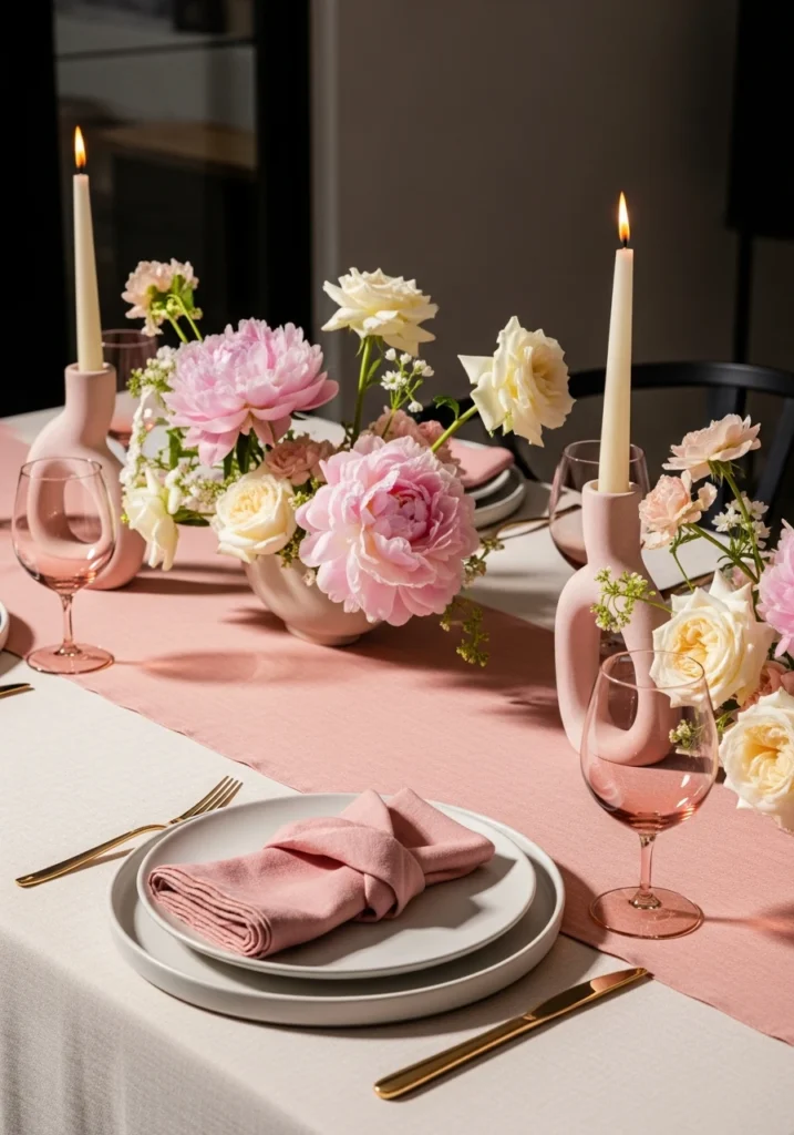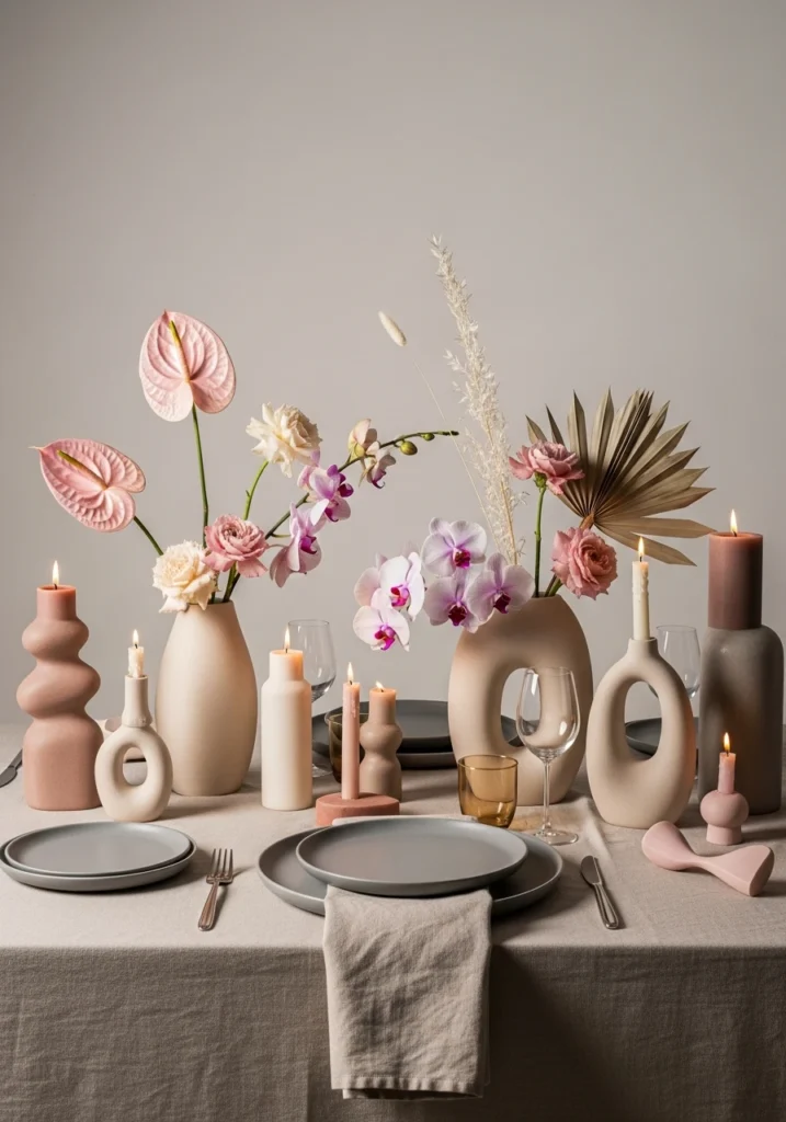 Modern minimalist approach focused on sculptural forms and negative space rather than traditional decoration—revolutionary restraint. Neutral linen base, matte stone plates, organic-shaped ceramic vases, and asymmetrical floral arrangements in soft pink and nude tones. Each object feels like a design piece, carefully spaced and intentional.