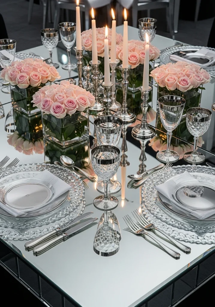 Ultra-glamorous approach centered around mirrored surfaces and crystal elements because sometimes more shine is the answer. Reflective base with crystal chargers, faceted glassware, and metallic accents in silver and platinum tones. Sleek modern floral arrangements feature pale pink roses in clear glass cubes.