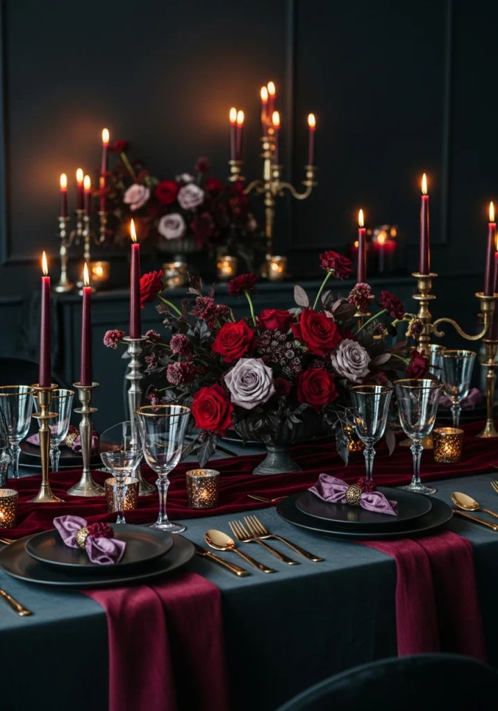Moody luxury styled in deep tones of charcoal, burgundy, and antique gold—bold Valentine’s choice that rejects typical pastels. Dark linens, matte black plates, gold-rimmed glassware, and rich velvet textures create dramatic foundation. Deep red and plum roses paired with dark foliage in floral arrangements.