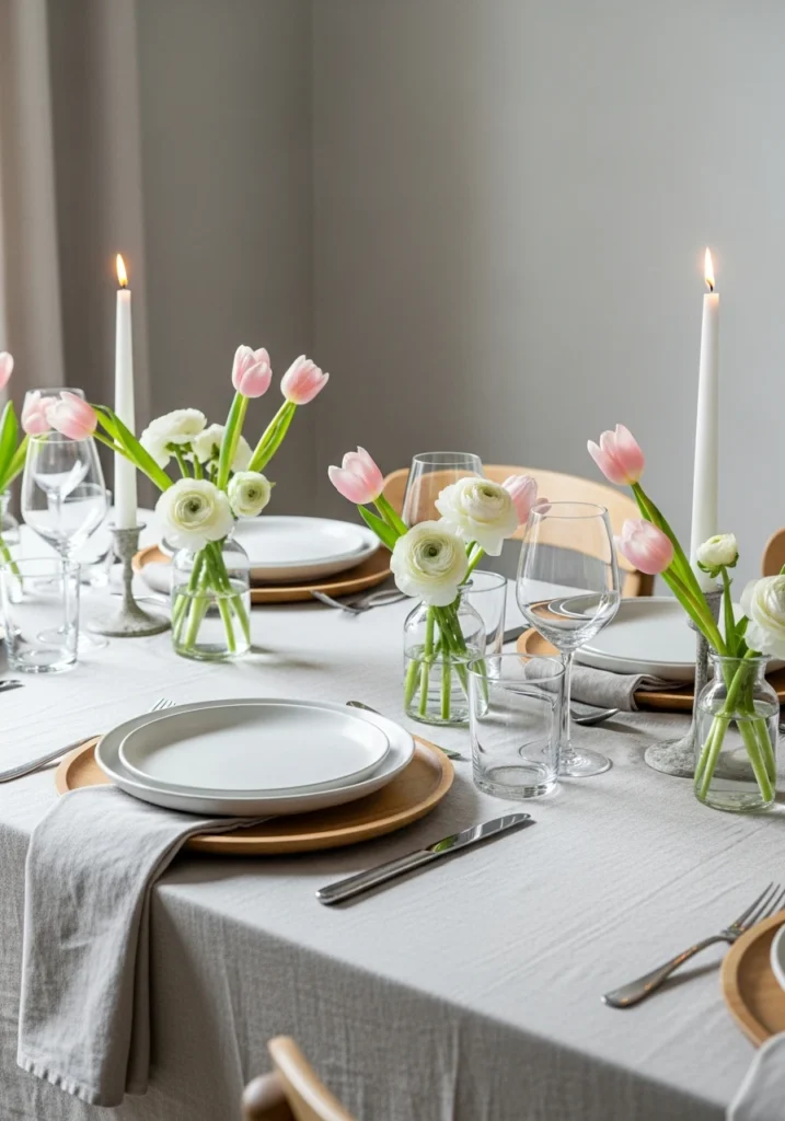 Modern Scandinavian-inspired approach focused on light, simplicity, and refined comfort—luxury through restraint rather than excess. Soft neutral linens, light wood elements, white ceramic plates, and minimalist glassware. Subtle natural floral arrangements featuring pale pink tulips and white ranunculus.