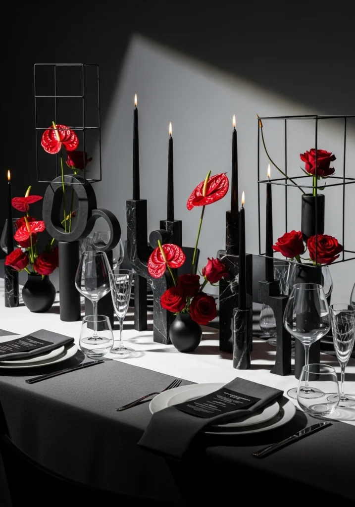High-fashion tablescape inspired by luxury fashion week events and brand dinners—bold design choices only. Monochrome linens, sculptural centerpieces, abstract candle holders, and statement glassware. Minimal but graphic floral arrangements using roses and anthuriums in structured compositions.