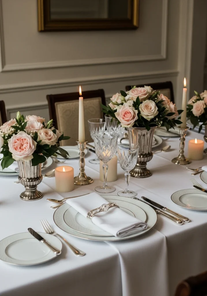 Refined “old money” approach inspired by heritage luxury and timeless elegance—no trends, no excess, just perfect proportions. Crisp white linens, porcelain plates with subtle detailing, crystal stemware, and polished silver cutlery. Classic restrained floral arrangements with pale pink roses and greenery in traditional vases.
