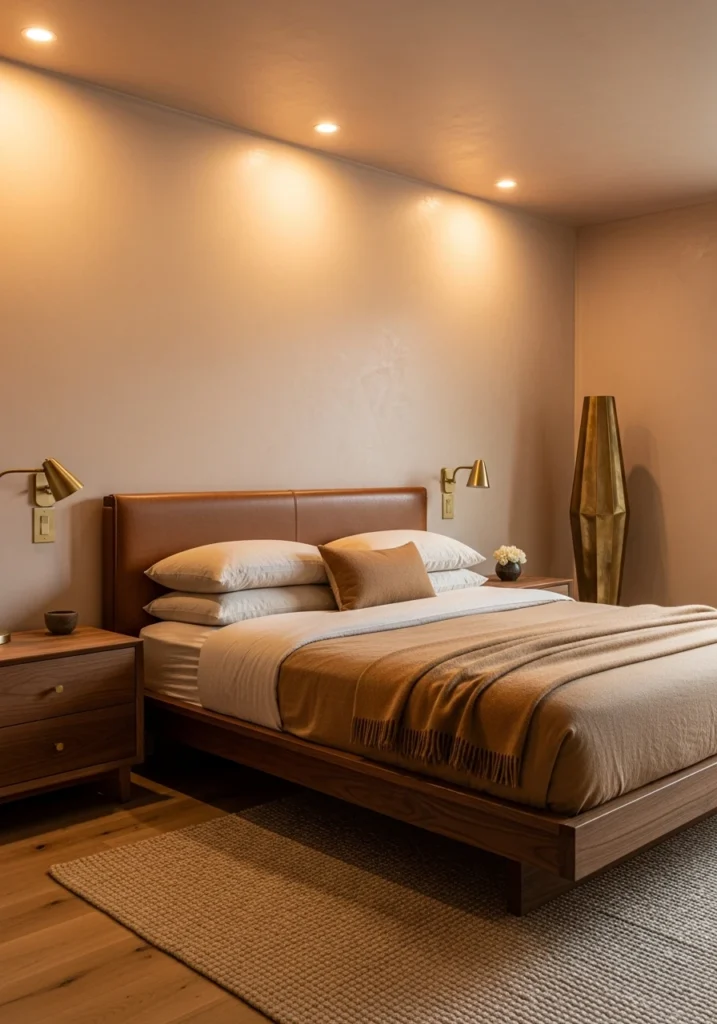 Start with walls (paint or plaster in warm earth tones), add a quality bed and bedding in natural fibers, layer in wood and leather accents, and don’t forget good lighting at multiple levels. Your bedroom (and your sleep quality) will thank you.