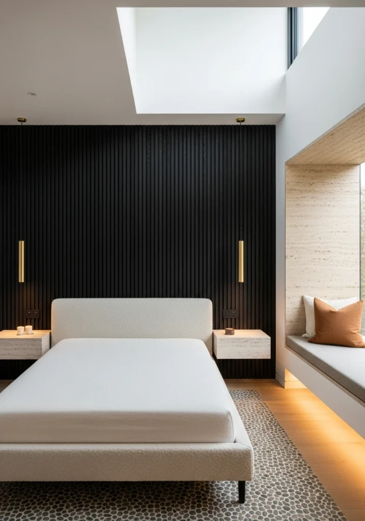 A charred-oak slatted feature wall behind the bed creates architectural drama, paired with a built-in stone-seat alcove at the window topped with a camel wool cushion. The low-profile bed in cream boucle keeps things soft and inviting.