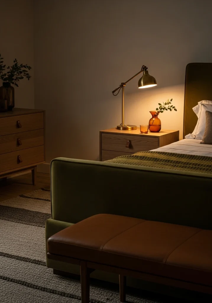 This moody yet warm bedroom centers around an olive-green velvet headboard that feels rich and inviting. A chestnut leather bench at the foot of the bed, smoked walnut nightstands, and brass task lamps layer in more warm tones and metallic accents.