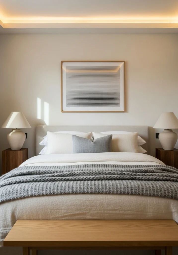 Framed abstract tonal art leans casually on the wall, while a narrow oak bench at the foot of the bed adds practical seating. Recessed warm perimeter lighting and soft morning light create gentle illumination throughout the day.