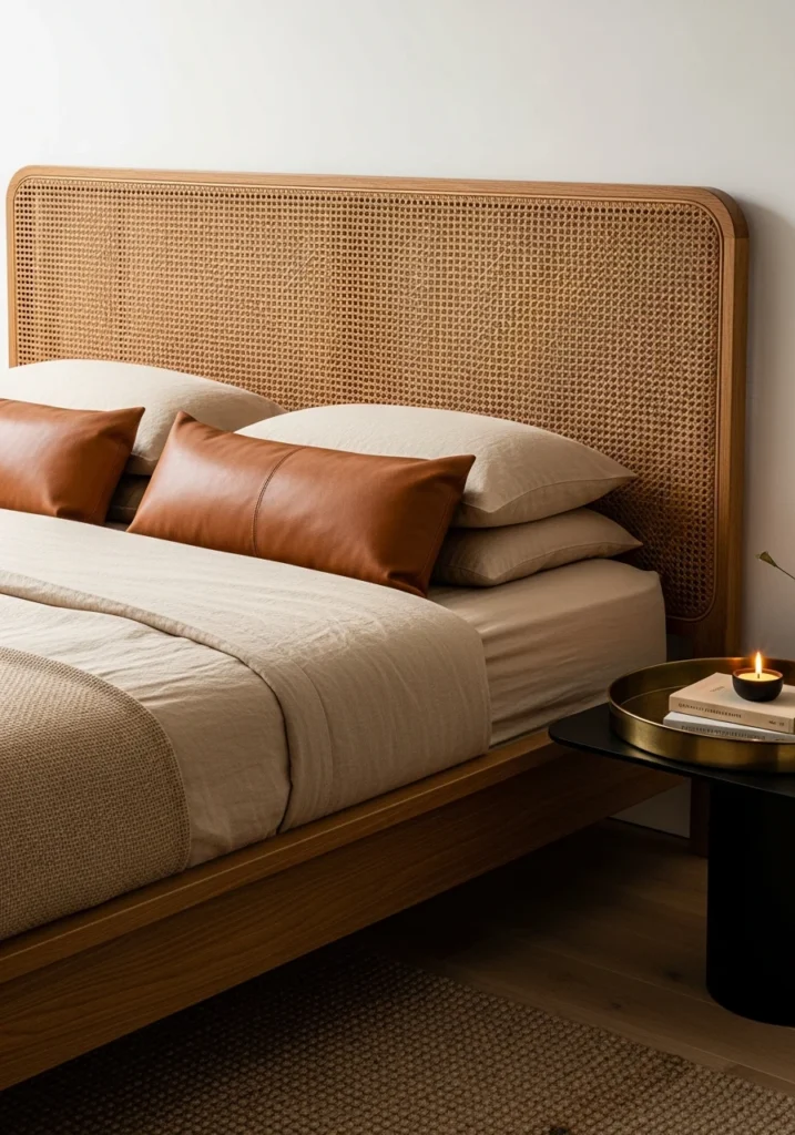 A wide woven rattan headboard in deep-dyed warm brown creates a textural focal point behind a low oak frame bed dressed in linen-cotton sheets in warm sand. Cognac leather lumbar pillows add rich color and texture.